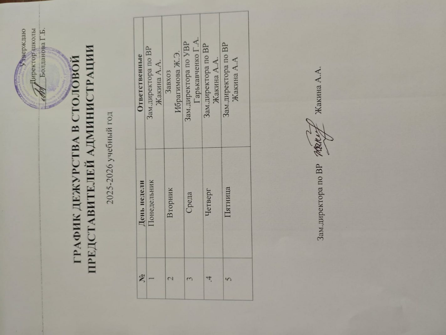 График дежурства в столовой представителей Администрации